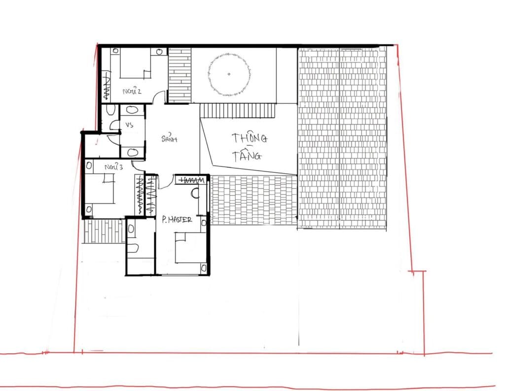 Không gian được bố trí khoa học với 5 phòng ngủ rộng rãi, phòng khách và bếp liên thông giúp tăng sự kết nối giữa các thành viên. Phòng thờ trang trọng, giữ gìn giá trị tâm linh truyền thống, trong khi các khu vực sinh hoạt chung được thiết kế mở, khoảng thông tầng tạo cảm giác thoải mái, gần gũi.