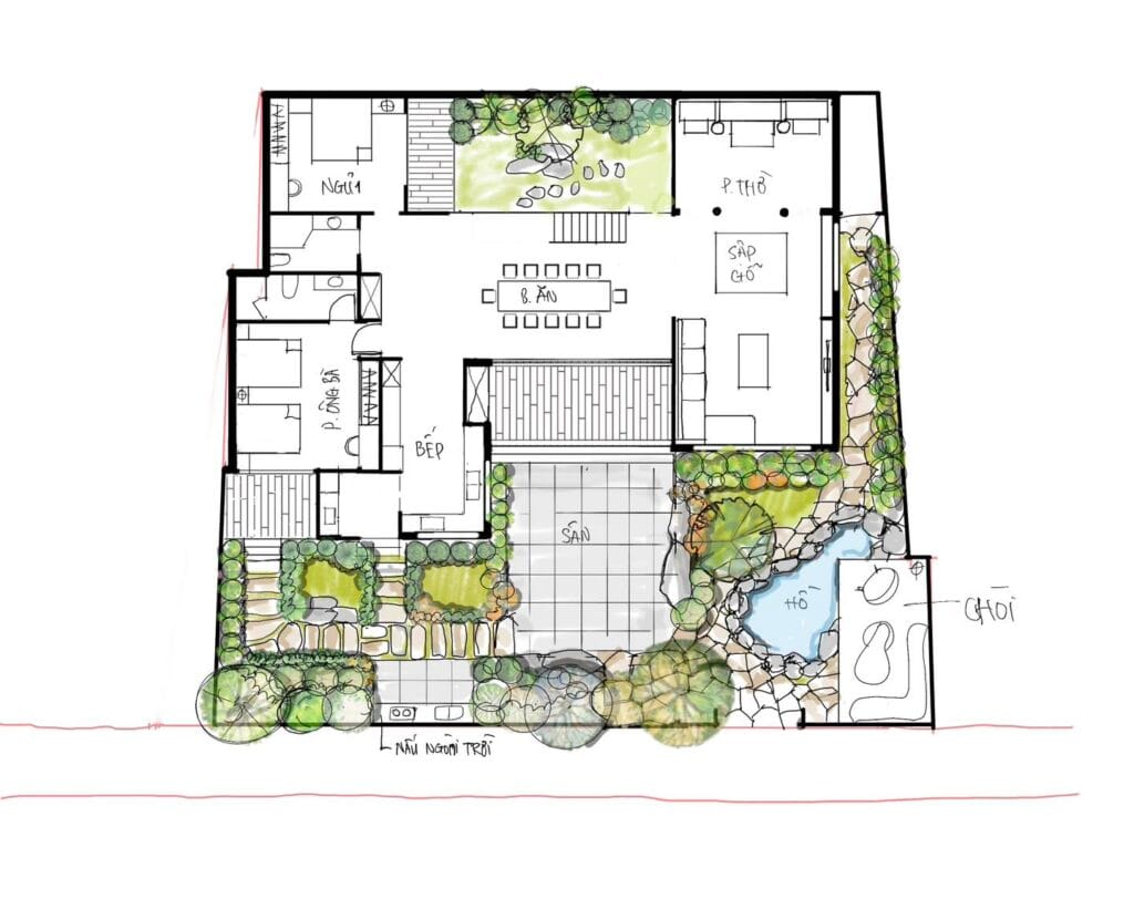 Ngôi nhà tận dụng tối đa ánh sáng và gió tự nhiên nhờ hệ cửa kính lớn, hiên rộng và sân vườn xanh mát. Những khoảng sân lát gạch, bồn cây nhỏ, cùng giếng trời thông thoáng giúp không gian trở nên hài hòa, mang đến cảm giác an yên, thư thái cho gia chủ.