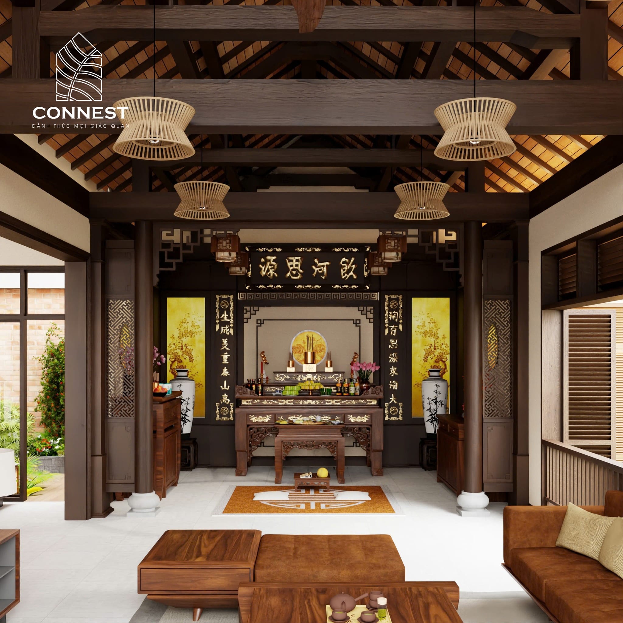 Không gian được bố trí khoa học với 5 phòng ngủ rộng rãi, phòng khách và bếp liên thông giúp tăng sự kết nối giữa các thành viên. Phòng thờ trang trọng, giữ gìn giá trị tâm linh truyền thống, trong khi các khu vực sinh hoạt chung được thiết kế mở, khoảng thông tầng tạo cảm giác thoải mái, gần gũi.
