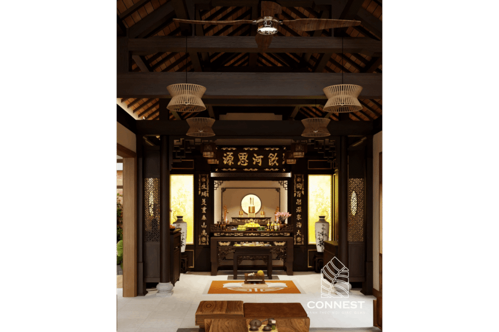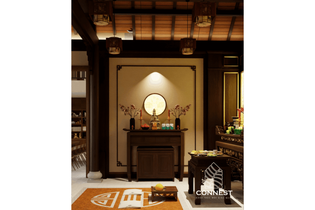 Phòng thờ được đặt ở vị trí trang trọng, giữ gìn giá trị tâm linh – một yếu tố không thể thiếu trong nhà truyền thống Việt.
