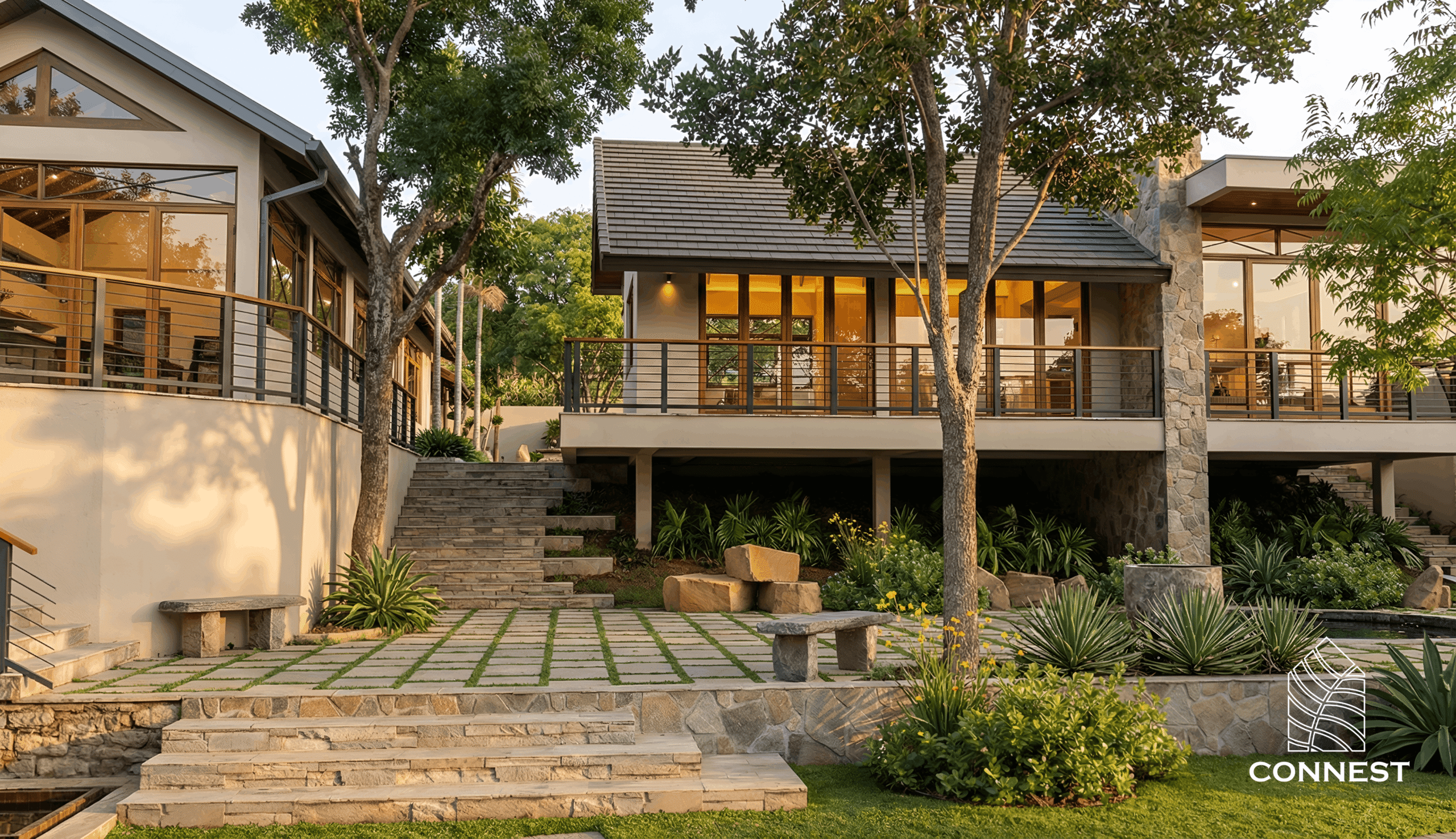 Trên khu đất rộng, ngôi nhà được tổ chức theo dạng cụm nhà thấp tầng, trải dài theo phương ngang thay vì dồn khối. Cách bố trí này giúp mọi không gian đều có sự tiếp xúc trực tiếp với sân vườn, ánh sáng và cây xanh.