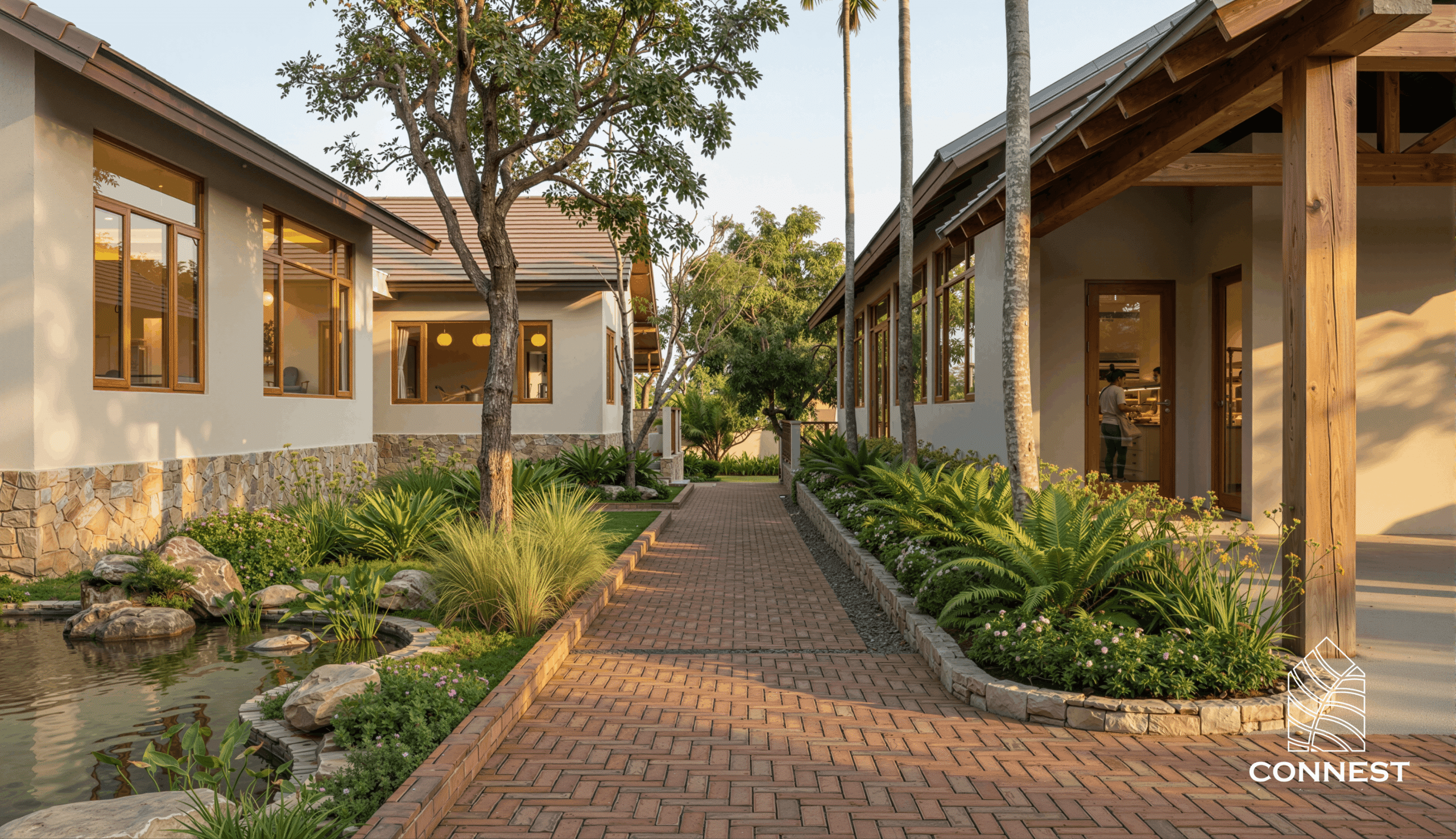 Điểm nhấn nằm ở các khối nhà tách nhẹ, liên kết bằng lối đi lát gạch và khoảng sân xanh, vừa đảm bảo riêng tư, vừa giữ được sự gắn kết tổng thể.